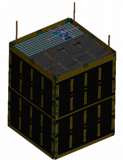 Structural analyses verifying the mechanical behaviour of the satellite under launch loads are performed with the finite element model. It is mainly composed of quadrilateral plane elements and contains approximately 40 000 nodes.