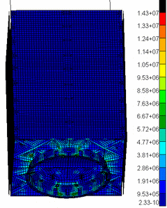 Figure 1: FEM model of UPMSat-2 (left) and stress distribution (Pa) due to inertial acceleration of 8.5 g in the vertical direction.